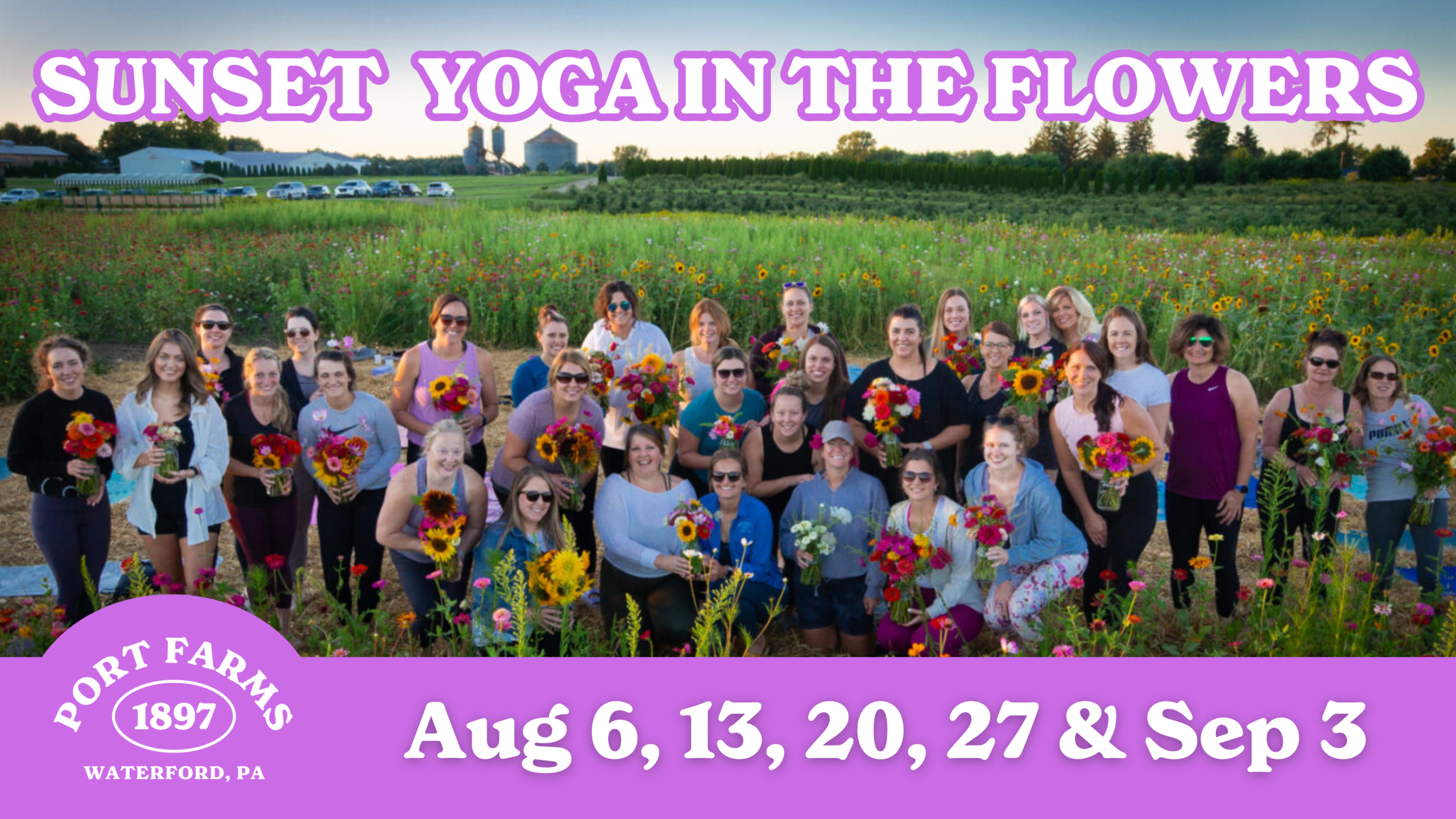 🧘 Purchase a Yoga Bundle Pass to receive one (1) mason jar for pick-your-own blooms and a one (1) hour yoga class for all 5 dates. Bring back your mason jar each class to pick new blooms. This option will be under the 8/6 date when choosing your ticket time.